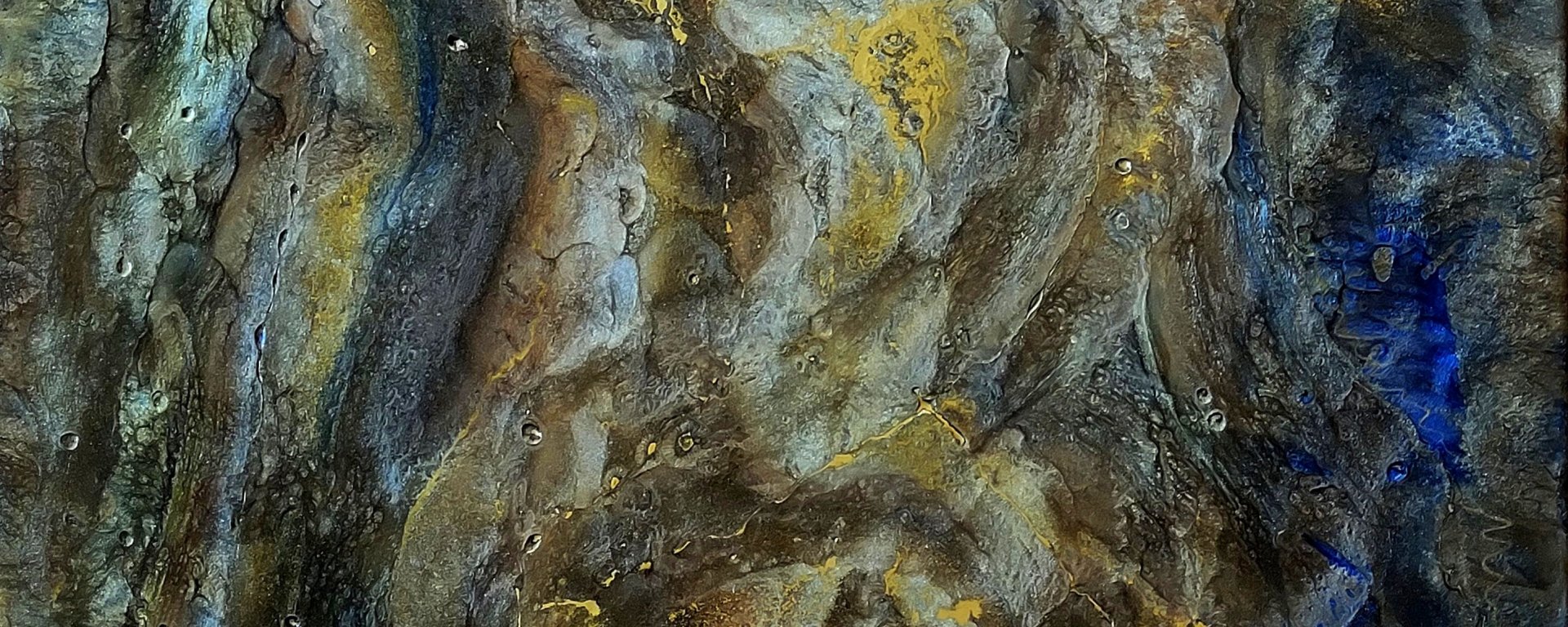 Toile composée de résine travaillée avec des pigments métalliques – châssis entoilé format 60/60 – bords peints – signée au dos. Prix : 330 €