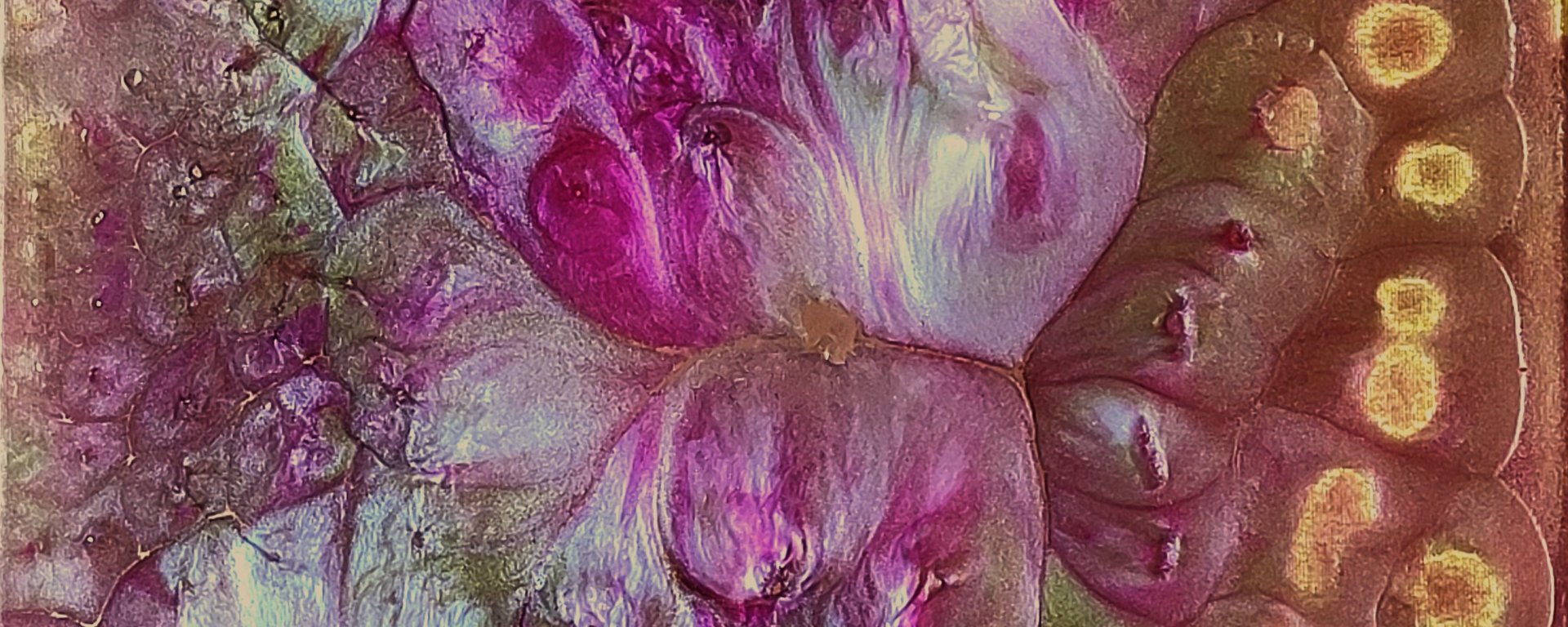 Toile composée de résine et de pigments nacrés – toile sur châssis format 40/50 – bords peints – signée au dos – prête à être accrochée. Prix : 220 €.