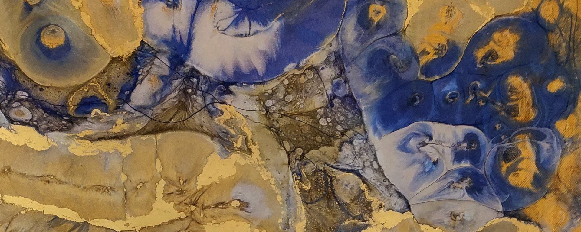 Toile composée de résine travaillée avec des pigments métalliques couleurs bleu, argent et or – toile sur châssis format 50/50 – bords peints – signée au dos – prête à être accrochée. Prix : 310 €.