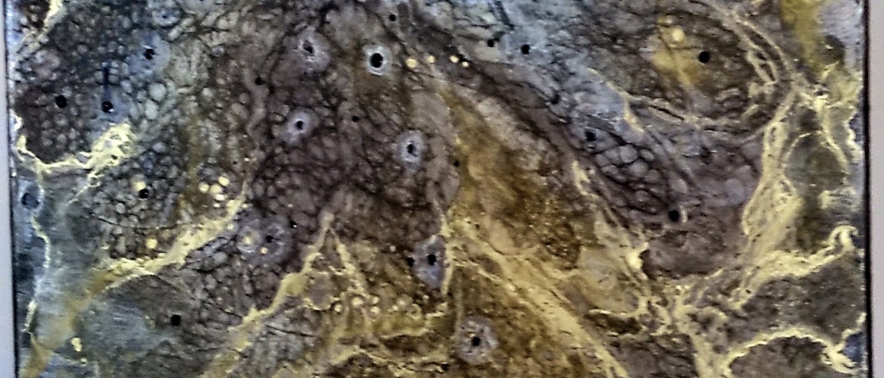 Tableau constitué de résine travaillée avec pigments et encres – toile sur châssis format 40/50 – bords peints – signé au dos. Prix : 220 €.