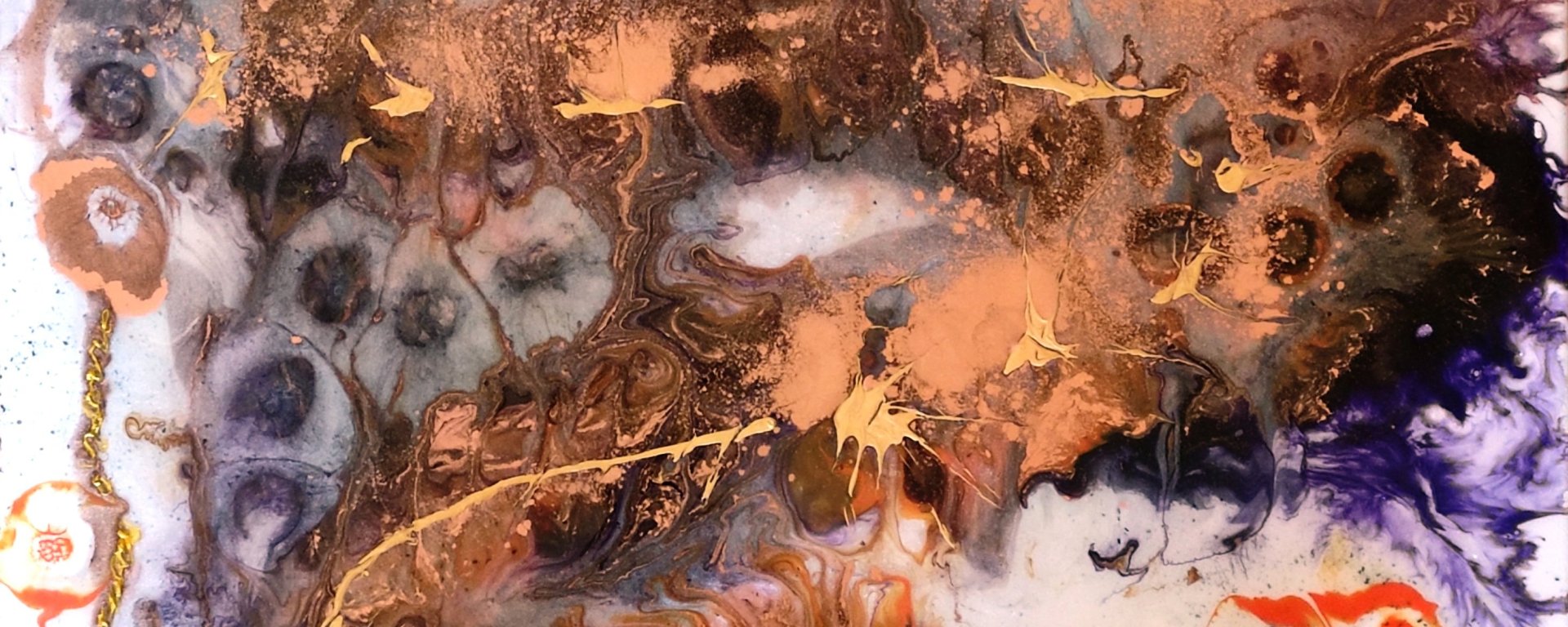 Peinture à la résine pigmentée – châssis entoilé de 50/50 – Or, cuivre, violet, orange, blanc – prête à être accrochée. Prix : 310 €