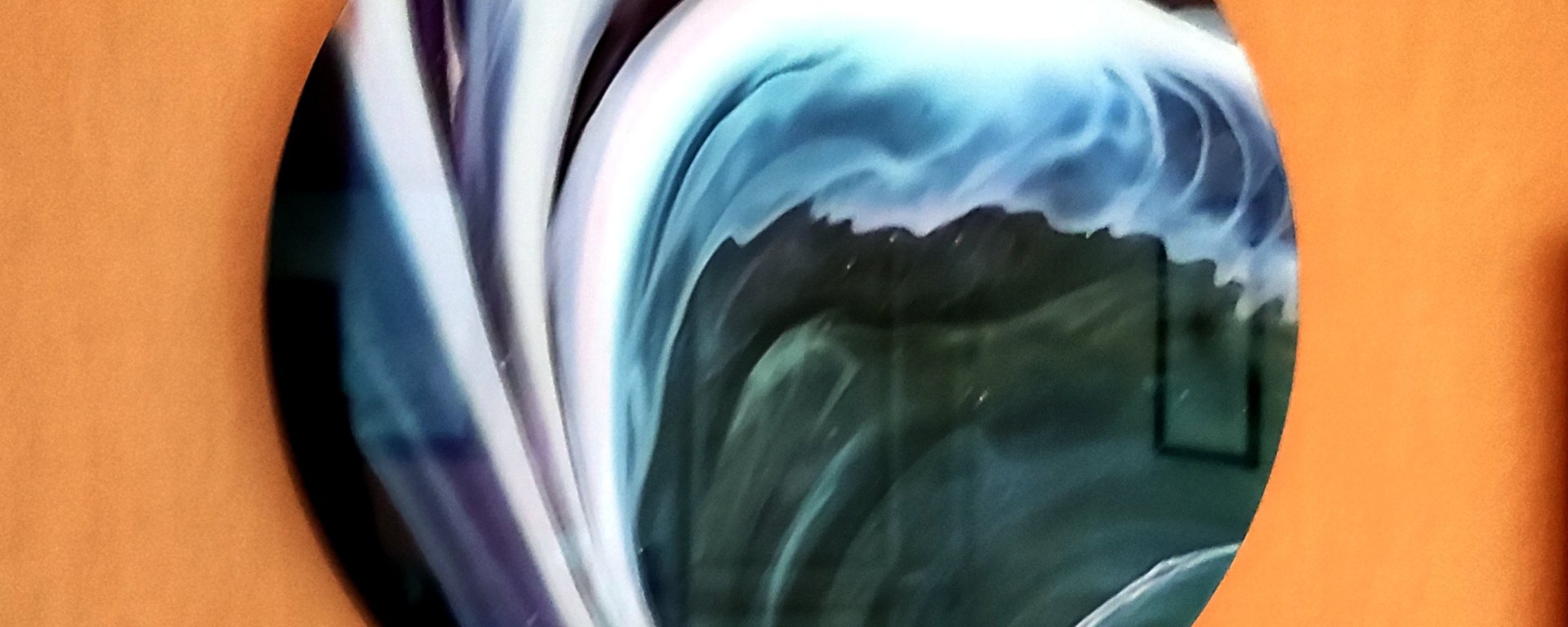 La création n° 2 est de format rond, d’un diamètre de 40 cm, épaisseur 5 mm. Système d’accroche via châssis aluminium rentrant. Prix en message privé.